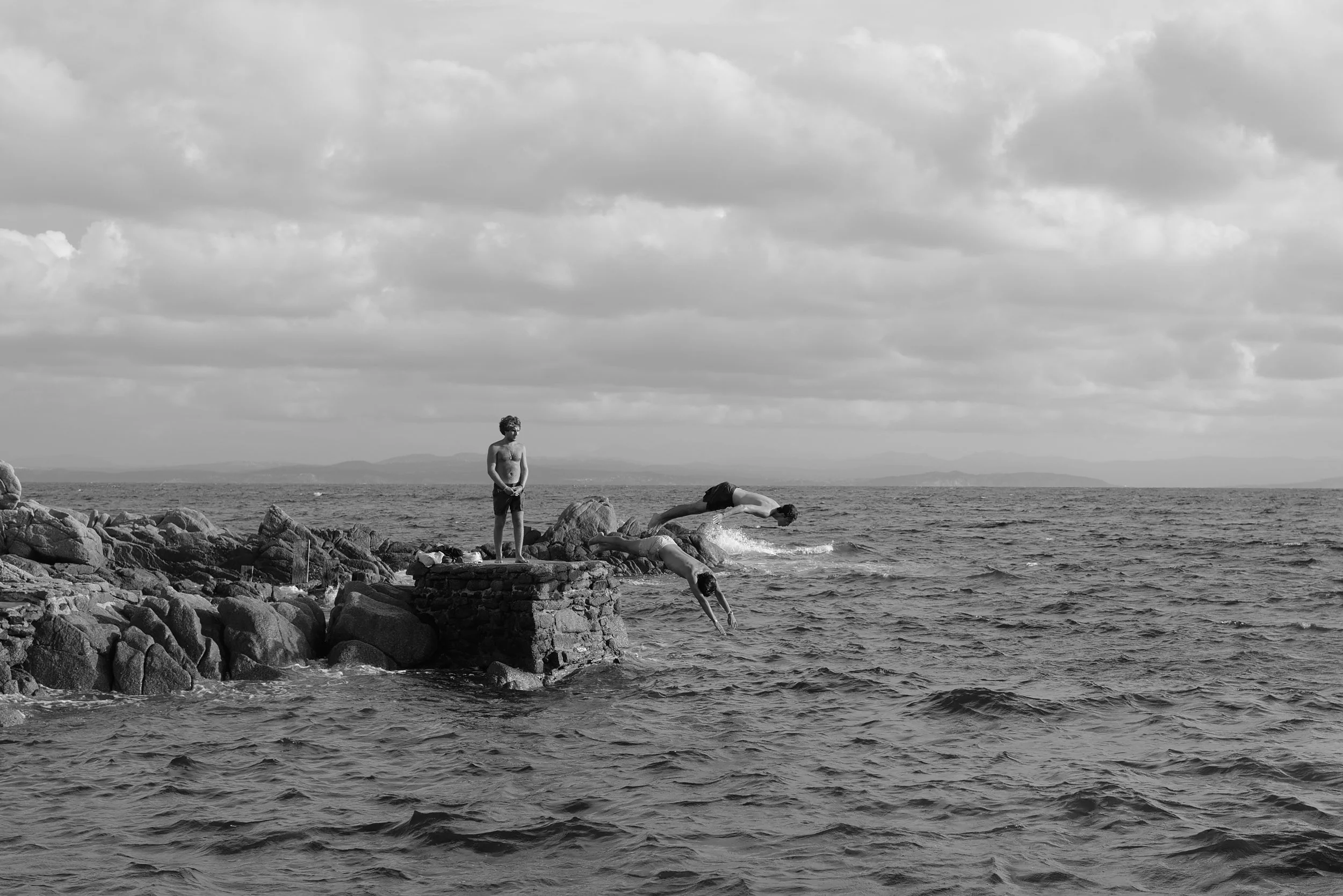 Three boys at a rocky shoreline, with two diving into the water and one standing on rocks, under a cloudy sky. View fullsize